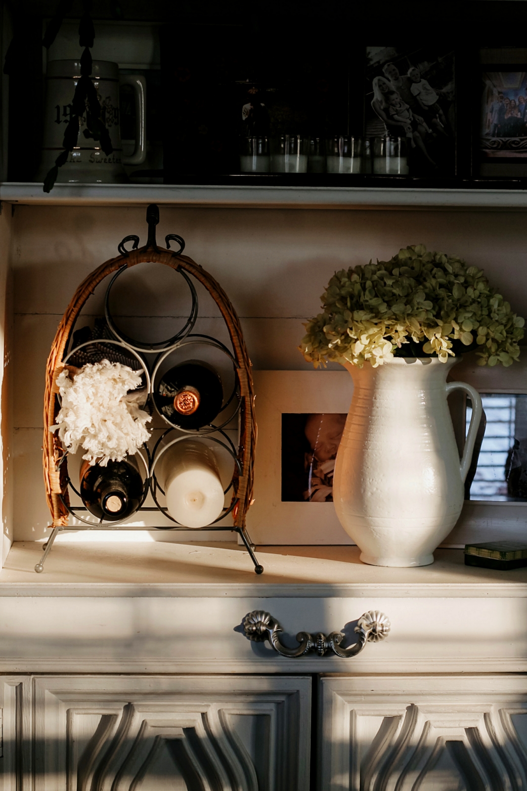 Here on a bottom shelf we have a wicker wine rack and a white pitcher full of faux hydrangeas. I like to add items to the wine rack, along with bottles of wine. So on this wine rack you will see a tall pillar candle and a stack of fringe edged cloth napkins.