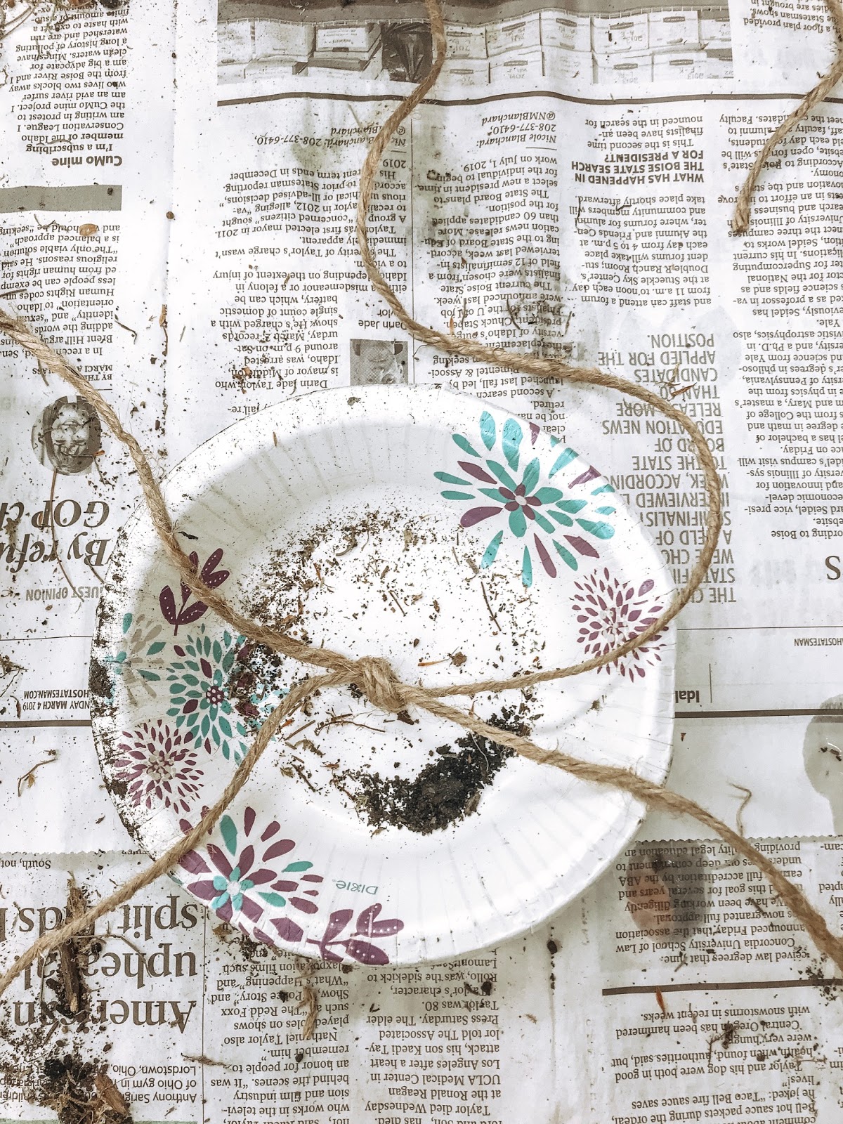 Now we tie it all up in a ball. Taking the four strands of twine that created your X, crisscross the strands and tie in a tight knot around your plant. Continue to crisscross and knot your strands of twine until you feel like the plant is tightly secured.