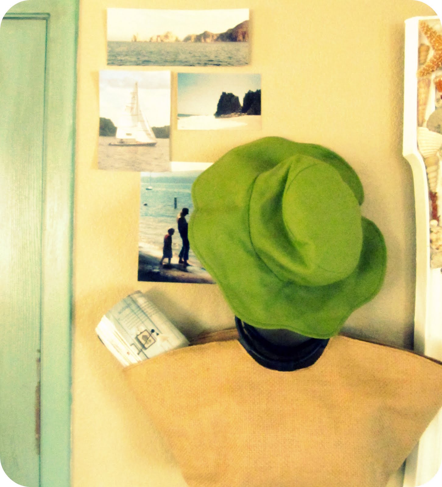 In the entry way I’ve hung up my seashell mirror, a straw bag, a green sun hat and a bunch of vacation photos.