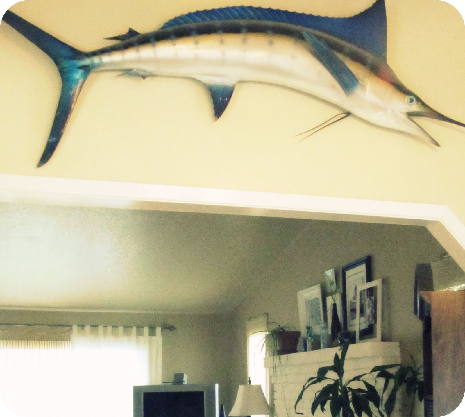 There is a story behind this marlin. It along with most of the cool stuff in my house came from Uncle Trace. He had what I call a mansion but sold it to live in a smaller home in the mountains. Therefore I totally scored on everything he didn’t have room for. Anyway, the nose on the marlin had busted off and Trace had it set aside to glue back on. Well you see, one day I was helping him clean up and threw away this stick thing I found. So now the poor fishy has no nose, and nobody will let me ever forget why.