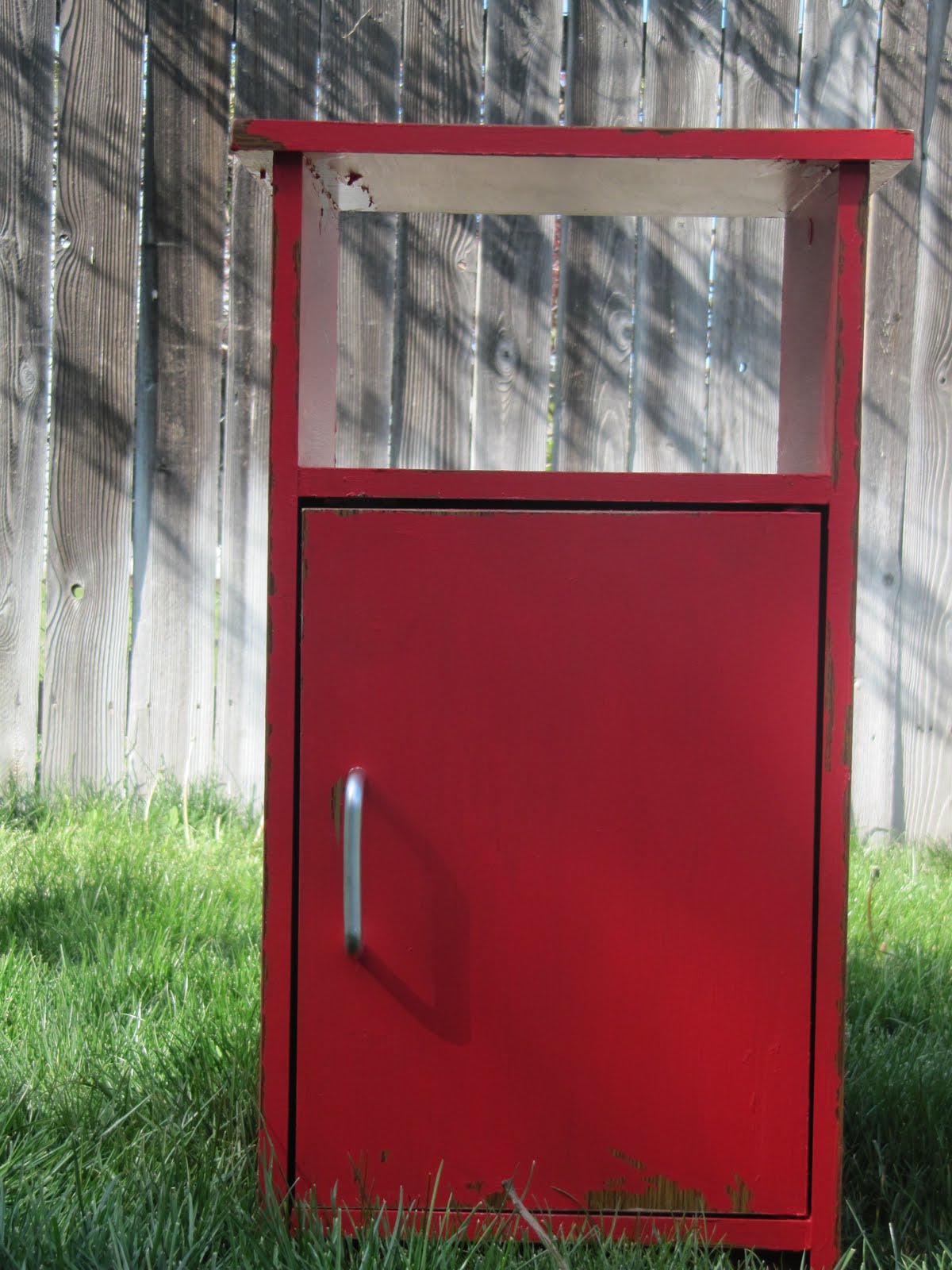 I painted the little night stand red. Spray painted the handle silver, and then roughed it up good.