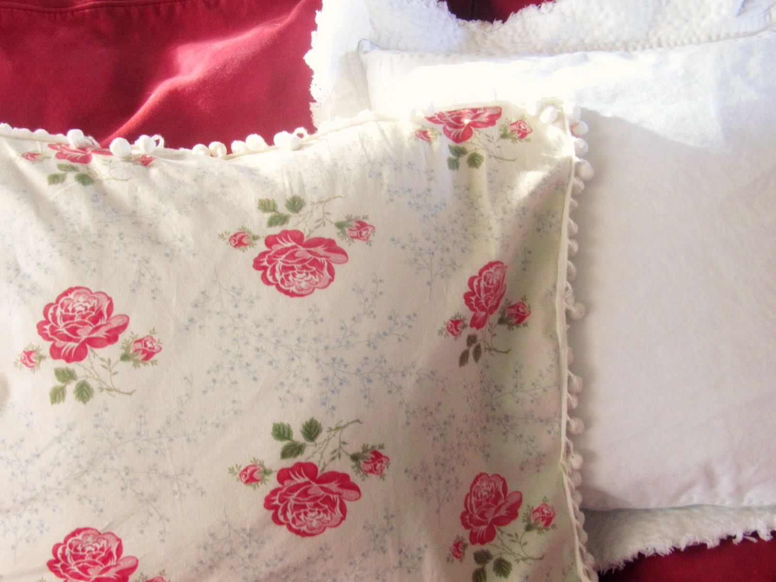 I also added some of the pom pom trim to a sweet little rose print pillow I made.