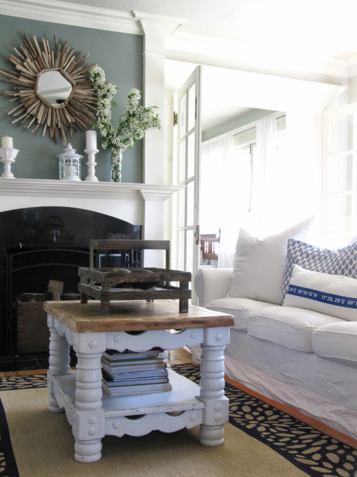 The rug looks great! And your white flowers look so pretty with your awesome driftwood mirror.You big tease…not showing us the chairs! lol!