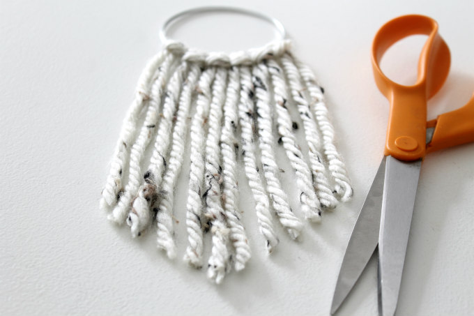 I added six strands of yarn to each of my ornaments.  After the strands were added, I trimmed the ends to create a layered look like this: