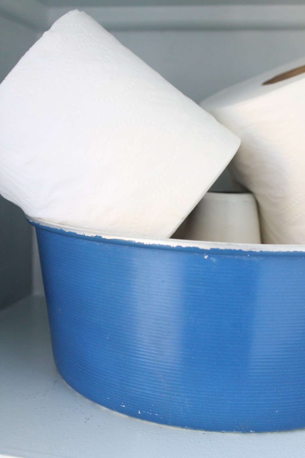The middle shelf has an old blue bundt pan that I recently picked up from a thrift store.  I just filled it with toilet paper. And then a few folded white washclothes are on the bottom shelf.