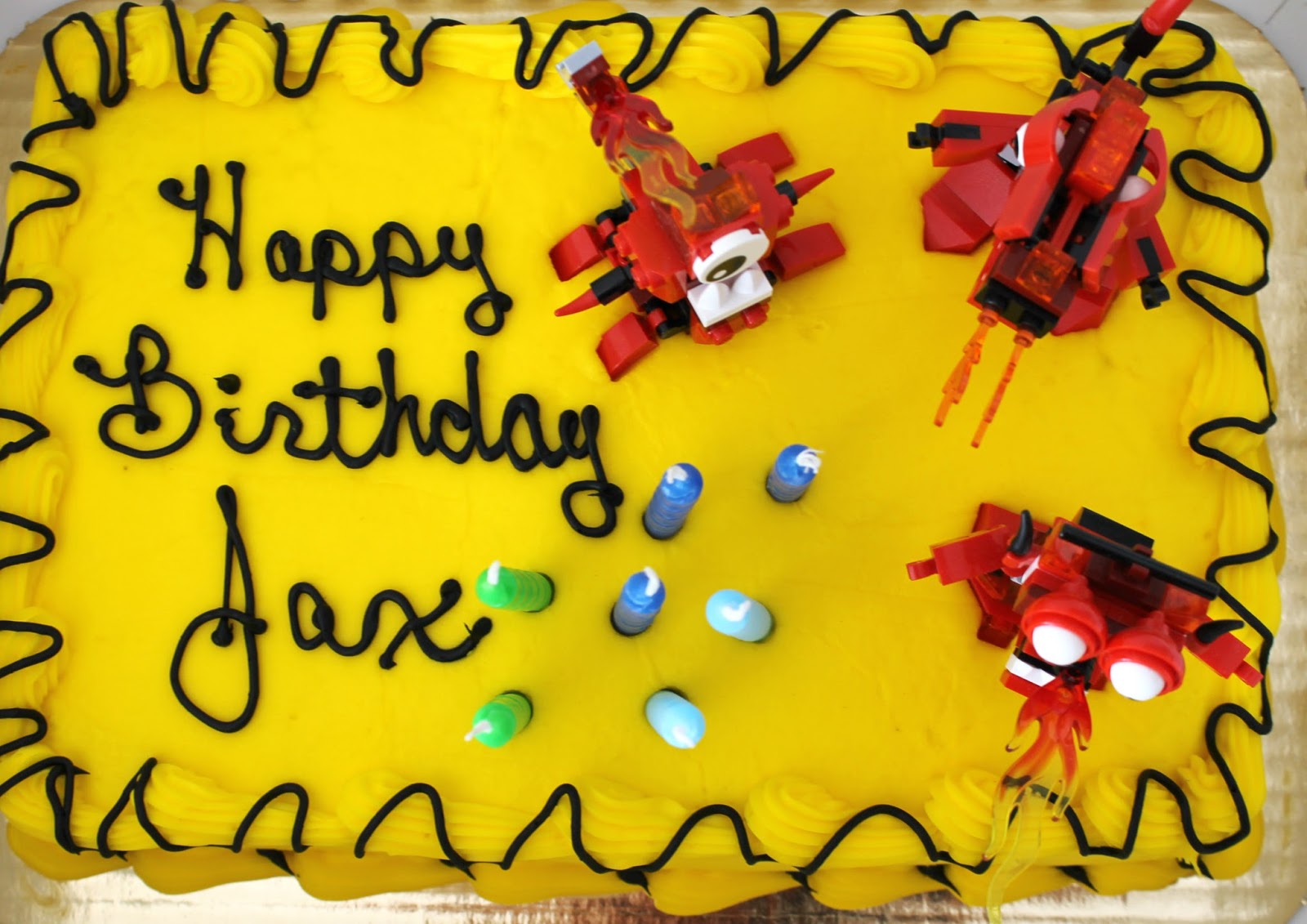 For the cake, we ordered it from our local bakery. We had them do the lettering on just one side so that we could add some Mixels on the other side.