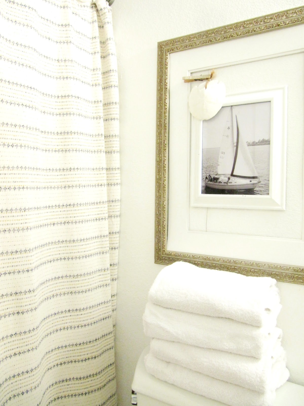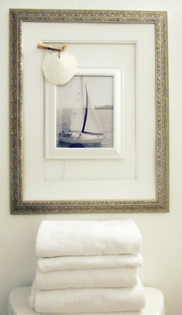 The shelf and wall mirror came down and was replaced with a few layered frames and a sailboat picture.