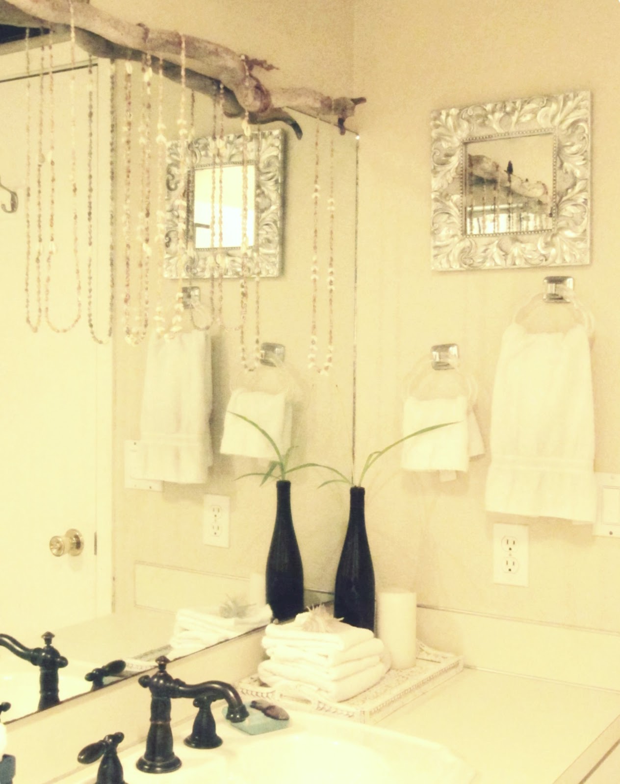 So here we go! This picture is from the first pictures I ever posted of my bathroom. I had hung my seashell necklace collection from a large branch above my mirror.