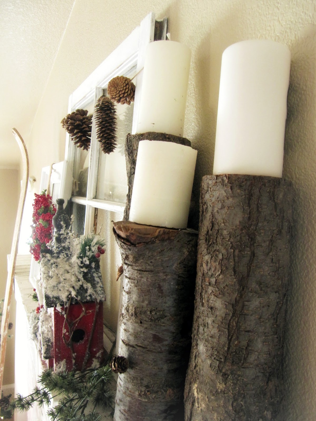 I sure have fun decorating my house for the Holiday Season. This year I was going for a Winter Cottage look. I tried to keep it simple and natural. I think the only thing New this year is the red snowy birdhouse I found on sale at hobby lobby.