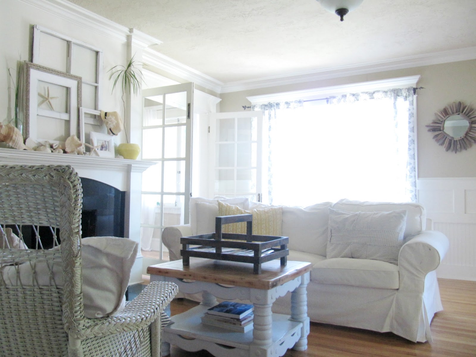 Love your mantel and the layering of items is very pretty. Your room looks lovely and airy. I like how you have added some texture to the softness with the wicker chair, driftwood mirror etc. Looking forward to when you share the armoire painted too. Ours is currently blue but I'm thinking of changing the colour or doing another blue.