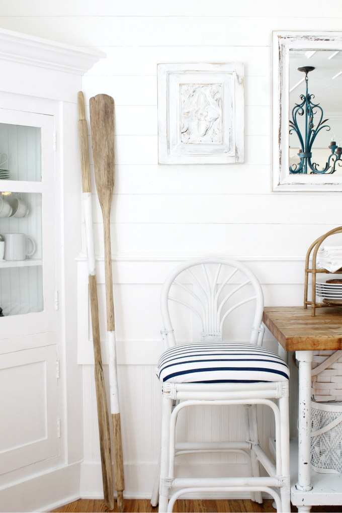 Next, I used wood glue to fix the broken piece on the oar and gave them a quick white stripe for a fun detail. I think they turned out pretty and look great leaning against the wall in our dining room.