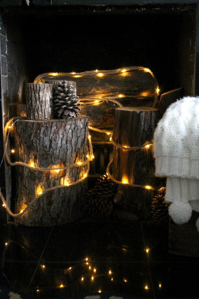 I wrapped the rope around some logs in our fireplace, and just Look at how fun it looks at night time.