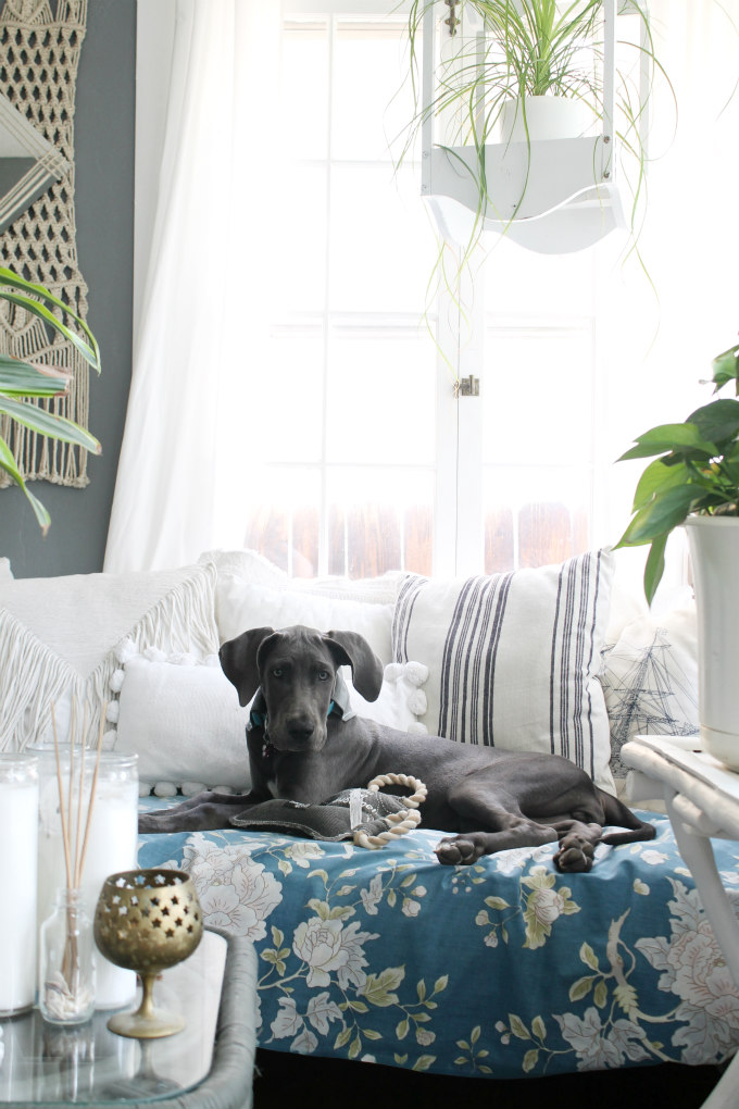 And then the blue floral sheet now covers the mattress on the daybed in our office. Even Stormy thinks it looks great in here!