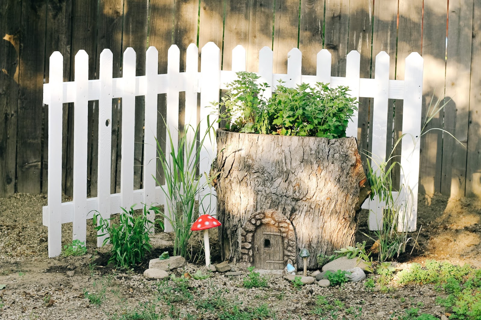 From there, I realized that this little garden was looking more like a fairy garden and so I added the cute little door to the stump as well as a few garden mushrooms.