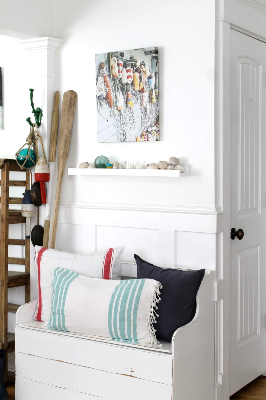 I’ve hung my new canvas on the wall in our living area and then I had fun creating this nautical display around it. I added myDIY picture ledgebelow the canvas and filled it with shells and candles. And then I brought in my own collection of boat buoys and hung them on a large green hook. The wood oars and coordinating pillows tie the whole look together.