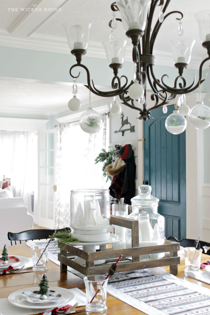 Hanging from the chandelier are glass ornaments that I filled up with more fake snow and a little tree branch.
