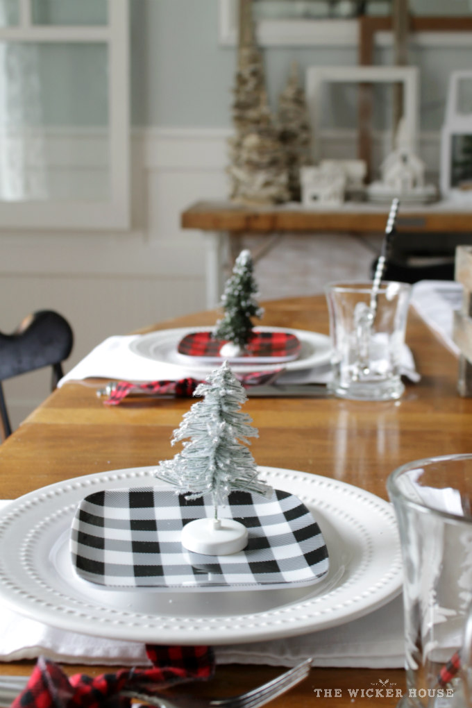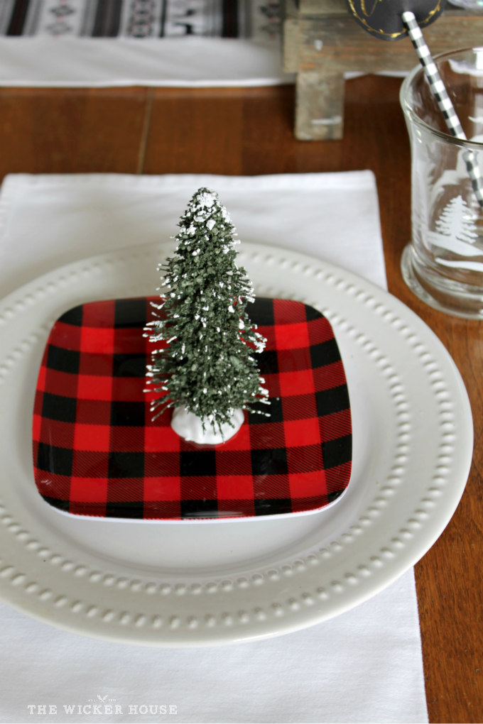 I added these attractive little side plates to my table to tie in the red and black plaid from across the room. I’ve also tied my silverware with red and black fabric scraps, keeping the look fun and casual.