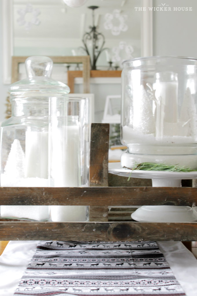 For the table’s centerpiece I have filled large glass containers with white candles, white miniature trees, and more fake snow. They look like large snow globes with a magical winter wonderland going on inside of them.