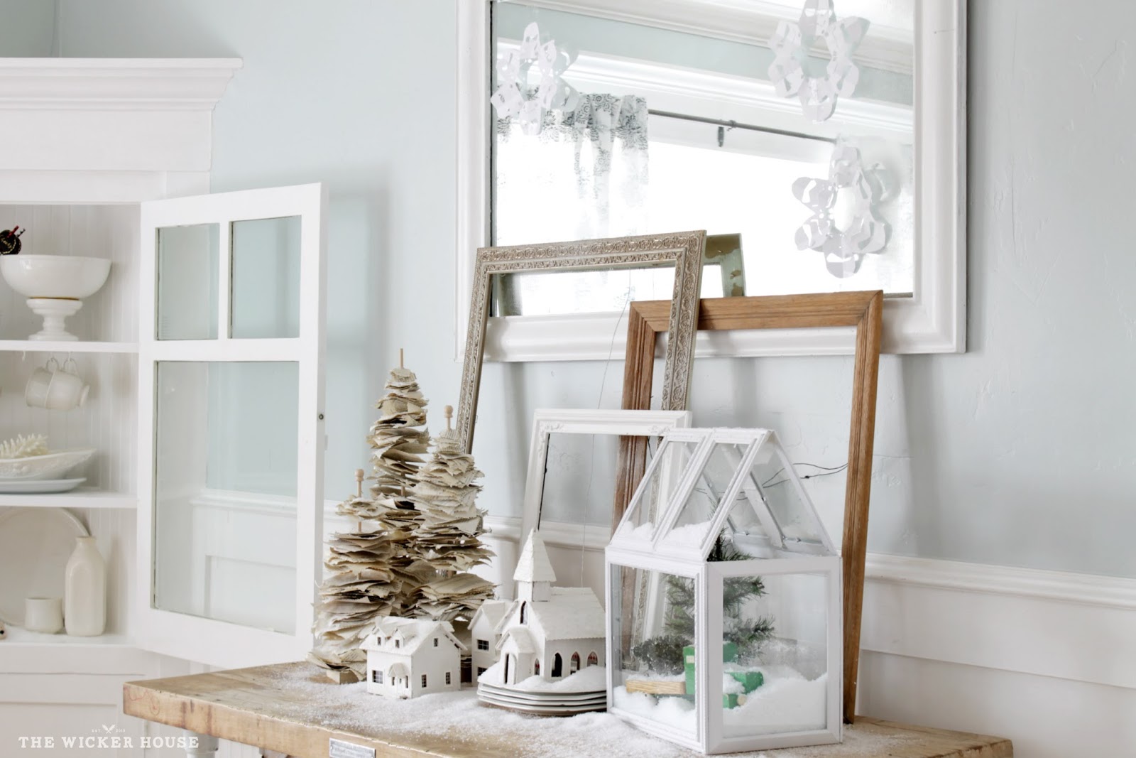 On the butcher block buffet table, I added some empty picture frames, a couple of book page trees and some little houses that were all made from previous years.