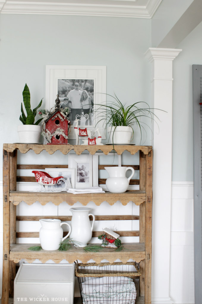This antique shelf’s styling stayed pretty simple, I just added a few pops of red decorations into the mix of white dishes.