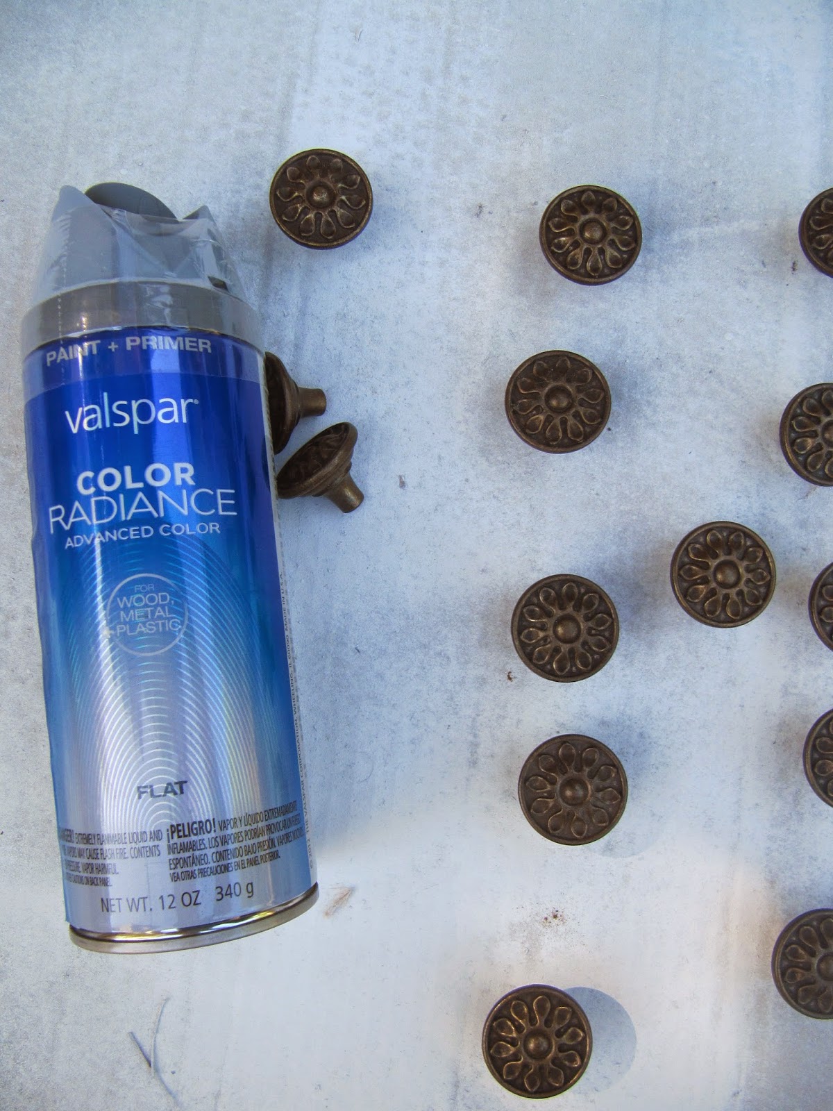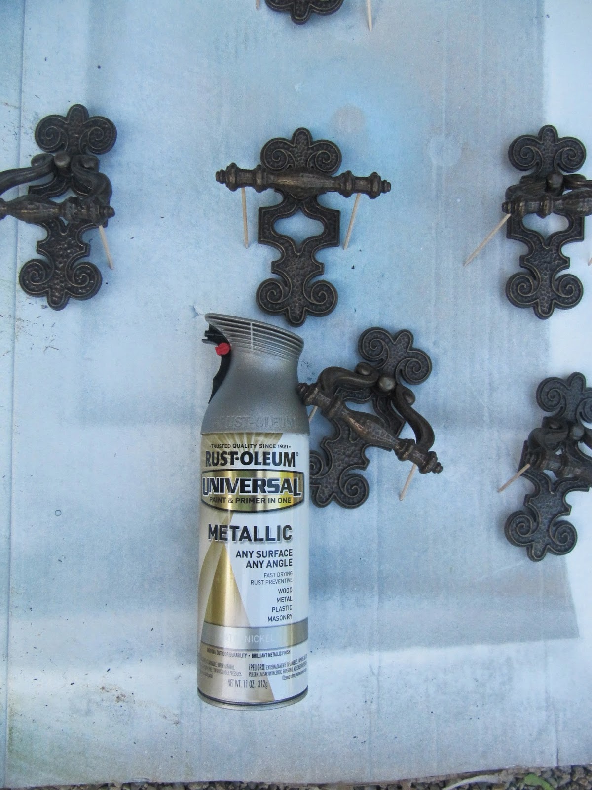 I choose to paint the knobs in a pretty blue by Valspar. I painted the handles in a metallic silver by Rust-oleum (if you look closely in the picture on the right, I used toothpicks to hold the handles up as to reach all angles).