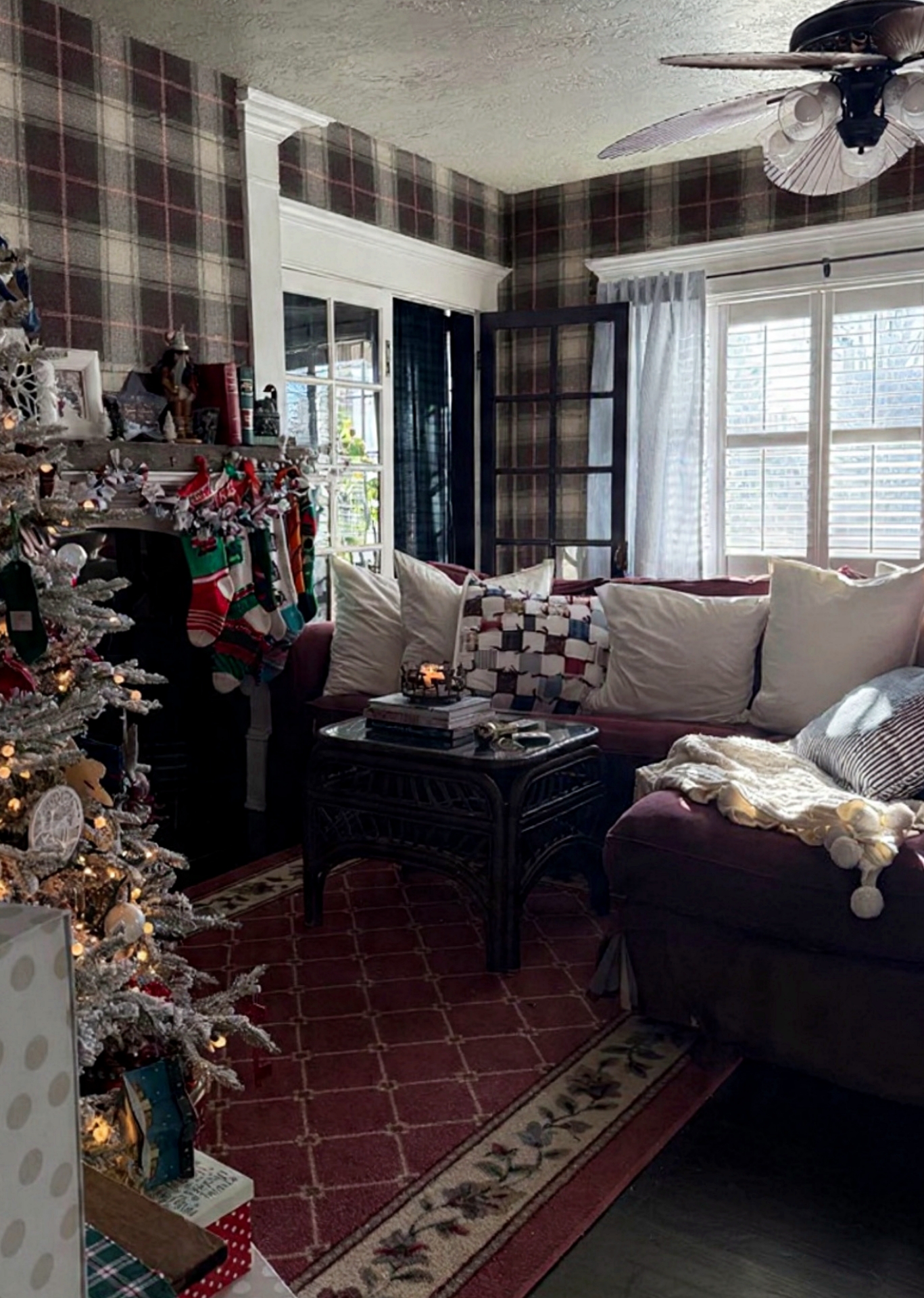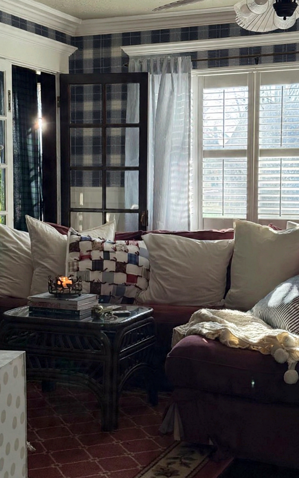 Our living room looks so much cozier with plaid wallpaper!