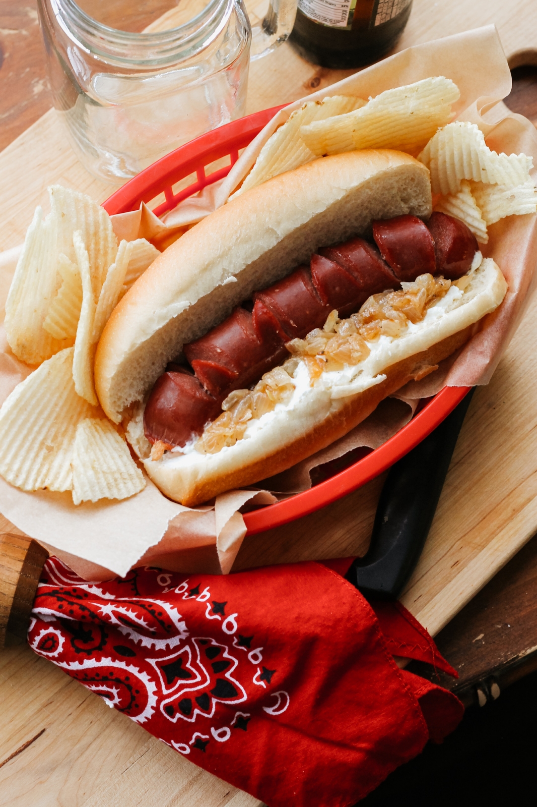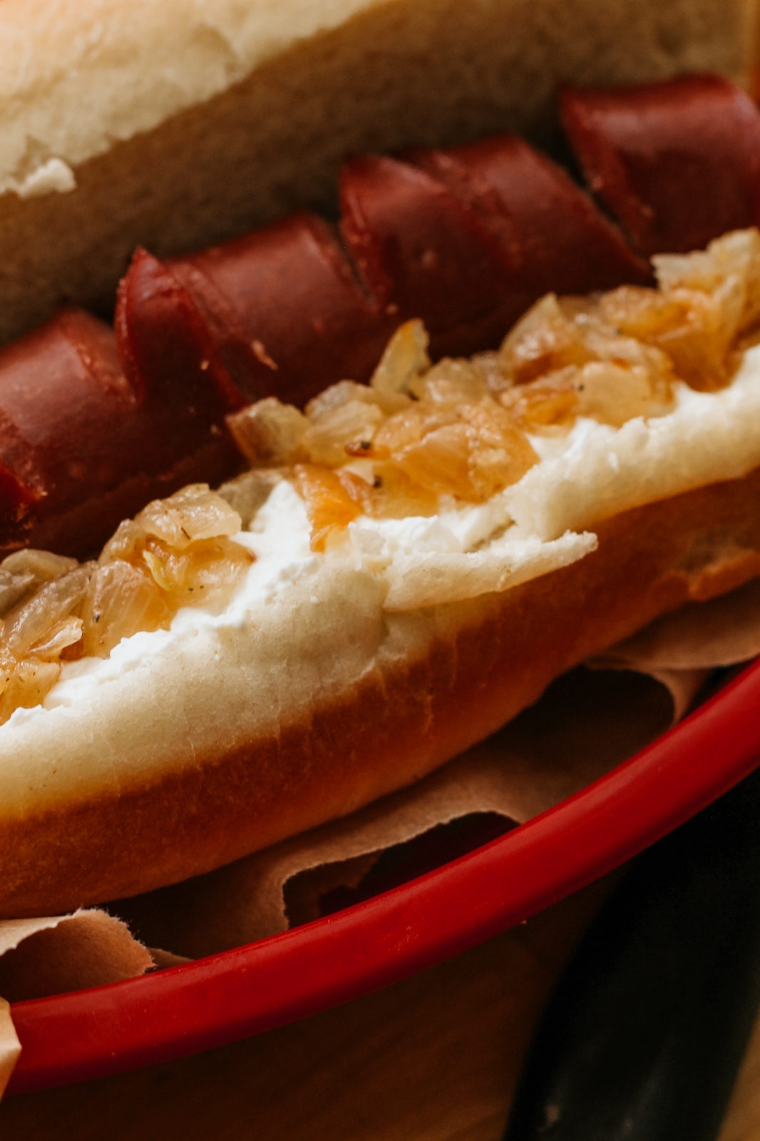The basic ingredients for a Seattle-Style Hot Dog are hotdogs, buns, cream cheese, and caramelized onions. These flavors all go so well together. There are some additional toppings you can add such as; sriracha, jalapeños, mustard, sauerkraut. I recently discovered candied jalapeños and I thought they went well with these hot dogs. Candied jalapeños come in a jar like pickles and are sweet, kinda like a sweet pickle, but they are not as hot as normal jalapeño, which can personally be too hot for me.