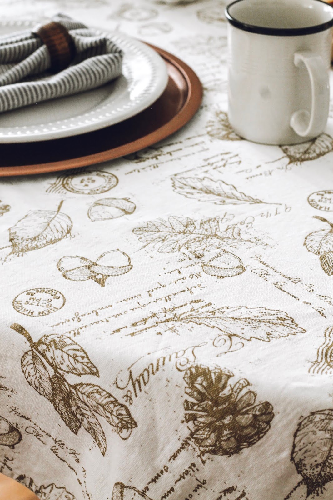 So the first thing I started with for this tablescape was the tablecloth. I painted my table a few years back and it has seen a lot of wear and tear since. My table really could use a fresh new paint job but until I get around to that, I figured it would be best if I just hid it all under a pretty tablecloth. #keepingitreal