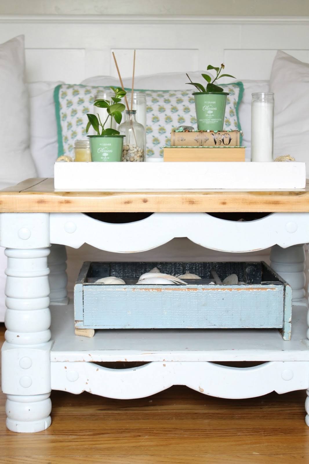I then had fun styling my coffee table, giving it a fresh new look.  I layered my tray with books, candles, and some of my favorite little things, like a sweet little dish and some rocks.