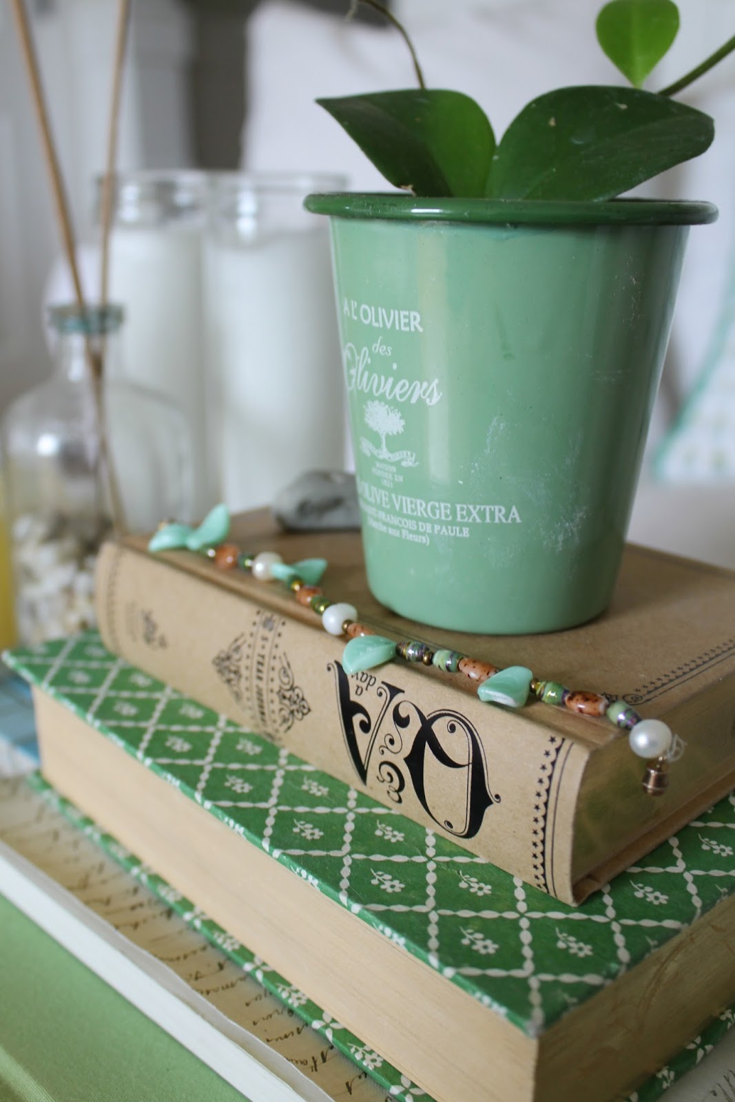 The cute little green enamel pots are from Hobby Lobby, also half price.
