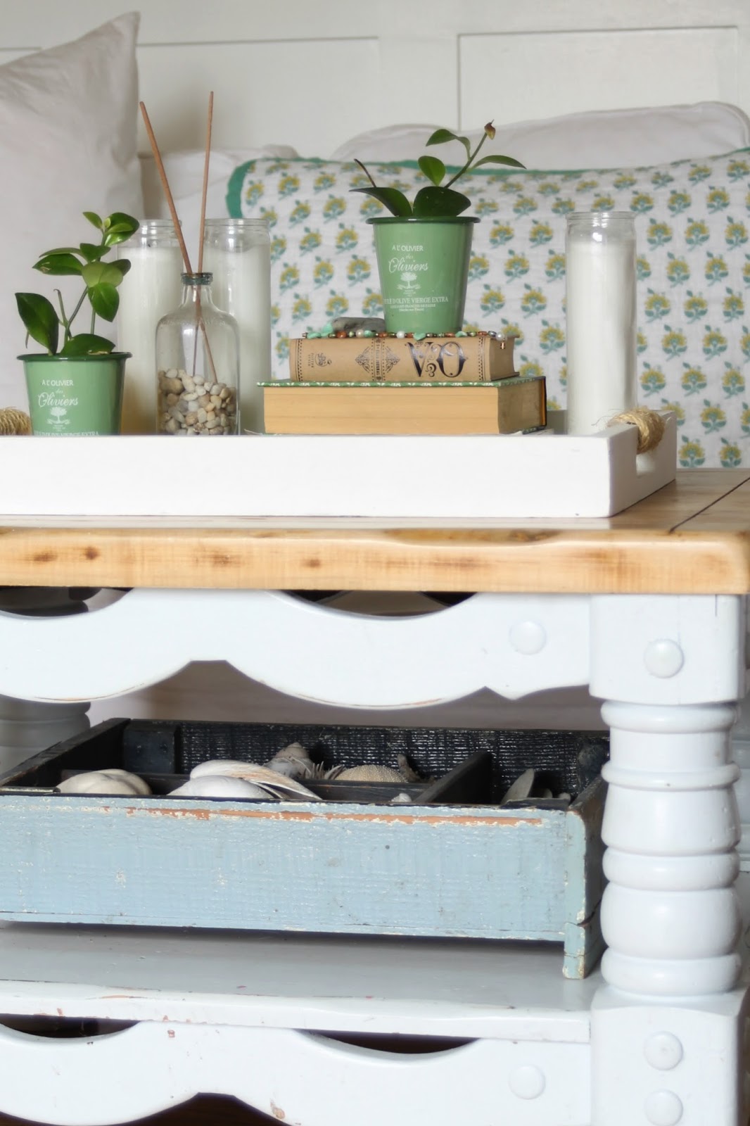 I then had fun styling my coffee table, giving it a fresh new look.  I layered my tray with books, candles, and some of my favorite little things, like a sweet little dish and some rocks.
