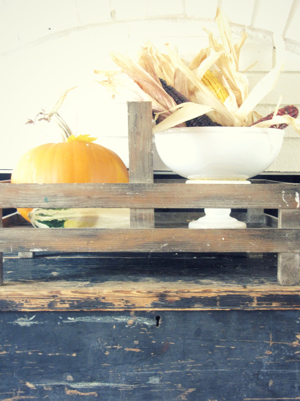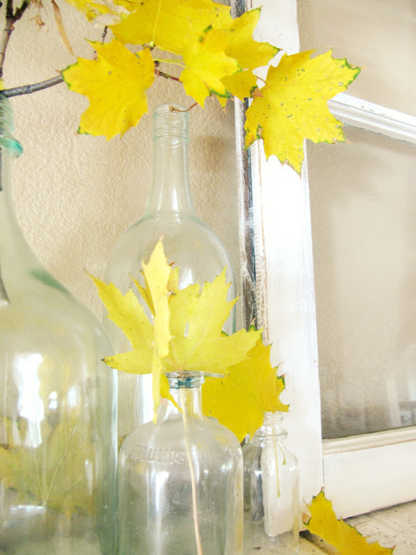 I mixed in is a couple leftover pumpkins from Halloween, a few cobs of Indian corn, glass bottles and a gold lantern.