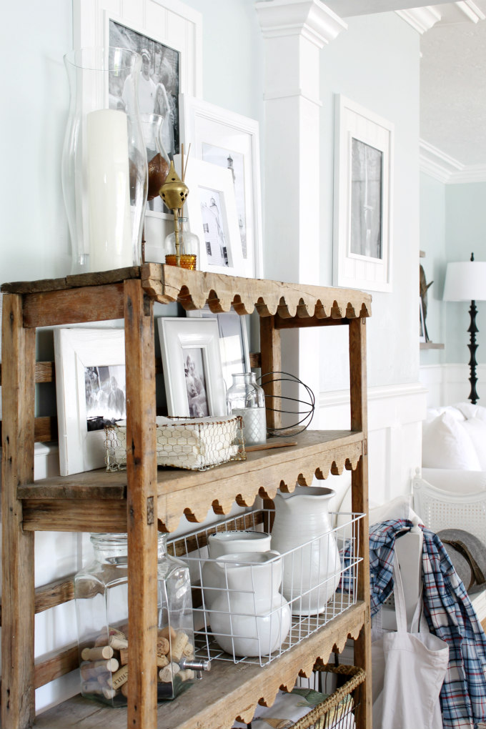 I also get a lot of comments about the cute scalloped edges.  A funny thing about this shelf, when I first saw it it was upside down so I thought it was a wine rack because of those scalloped edges.  I was glad to find out it wasn’t a wine rack….that would have taken a lot of wine to fill up, and that would never happen because I would end up drinking all of the wine 🙂