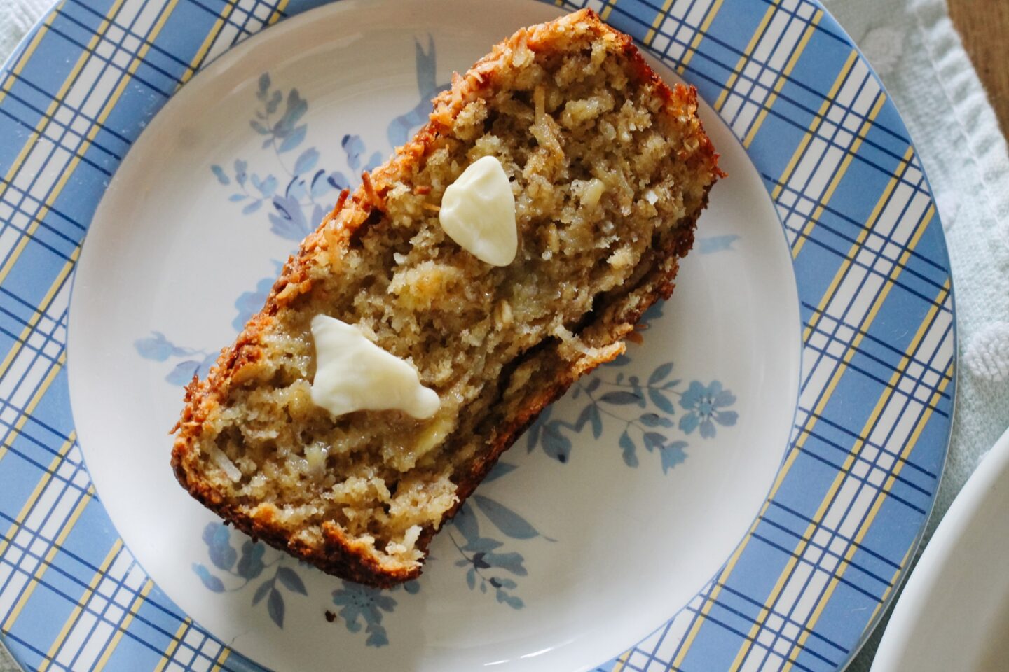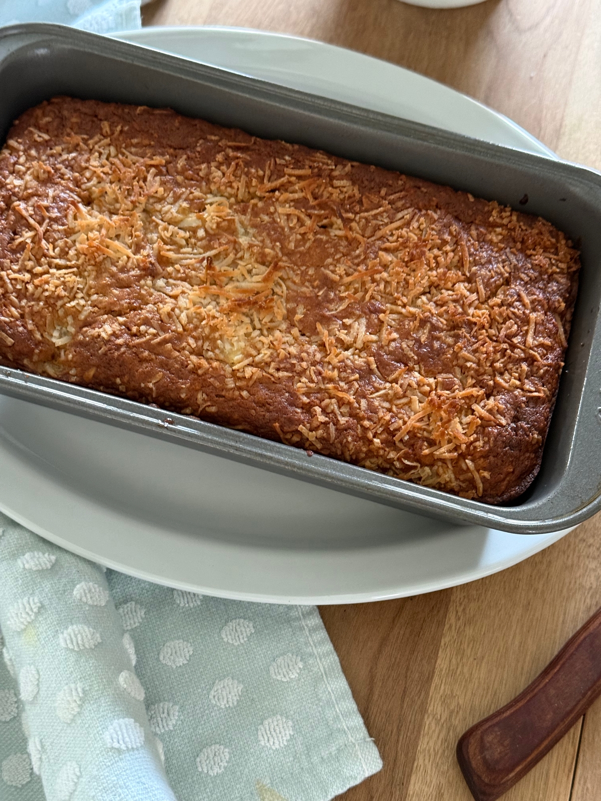 As the banana bread bakes, the coconut on top begins to toast and turns a beautiful golden brown. It gives the loaf a slightly crisp topping and adds even more coconut flavor. Toward the end of the baking time, it’s a good idea to keep an eye on the bread so the coconut doesn’t burn. If it starts to get too dark, you can loosely place a piece of foil over the top while the bread finishes baking.