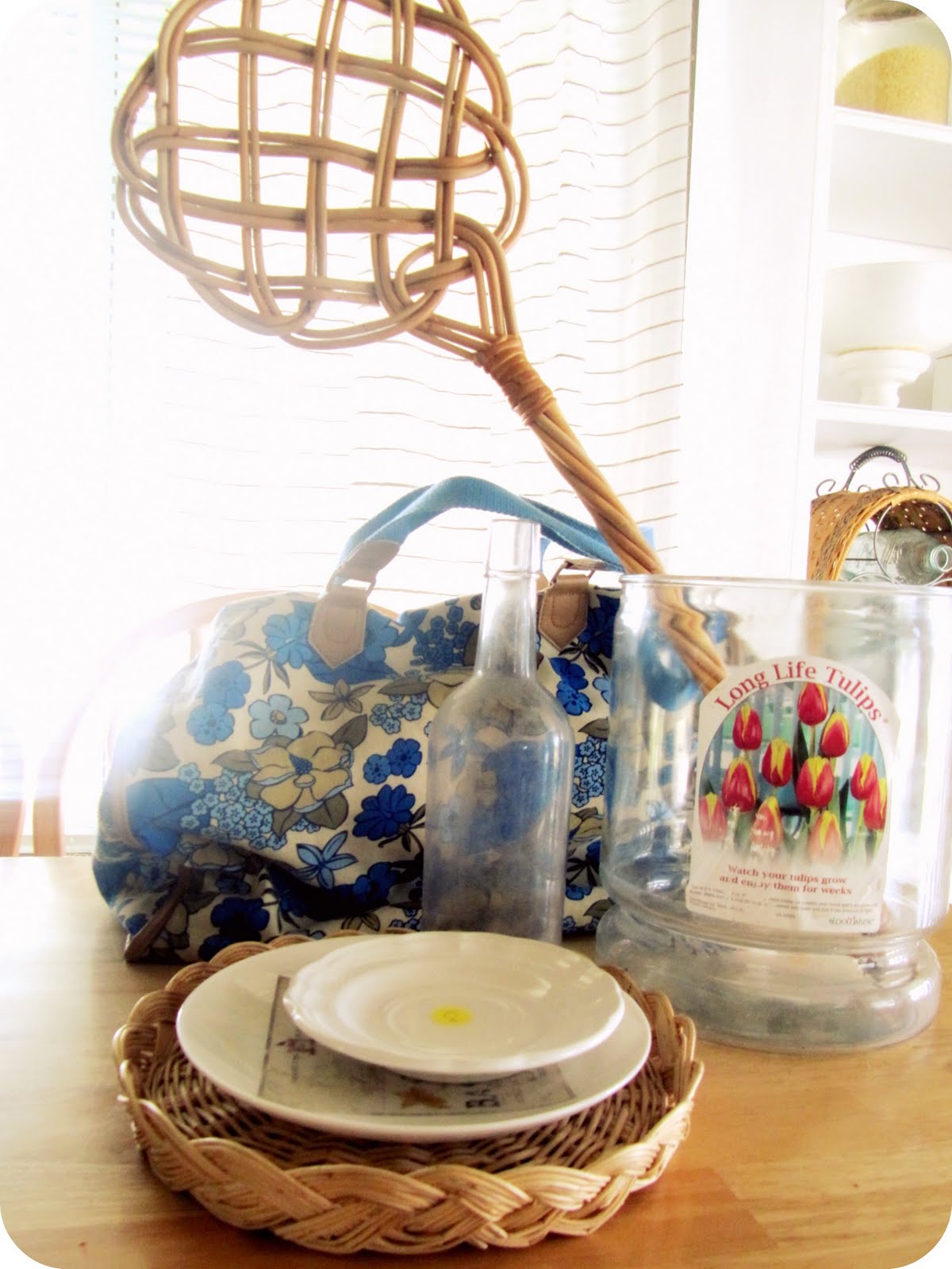 The plates and the wicker plate holder all found a home in the kitchen.  I then re-arranged my shelves, after dusting everything first.  Open shelves get super dusty!