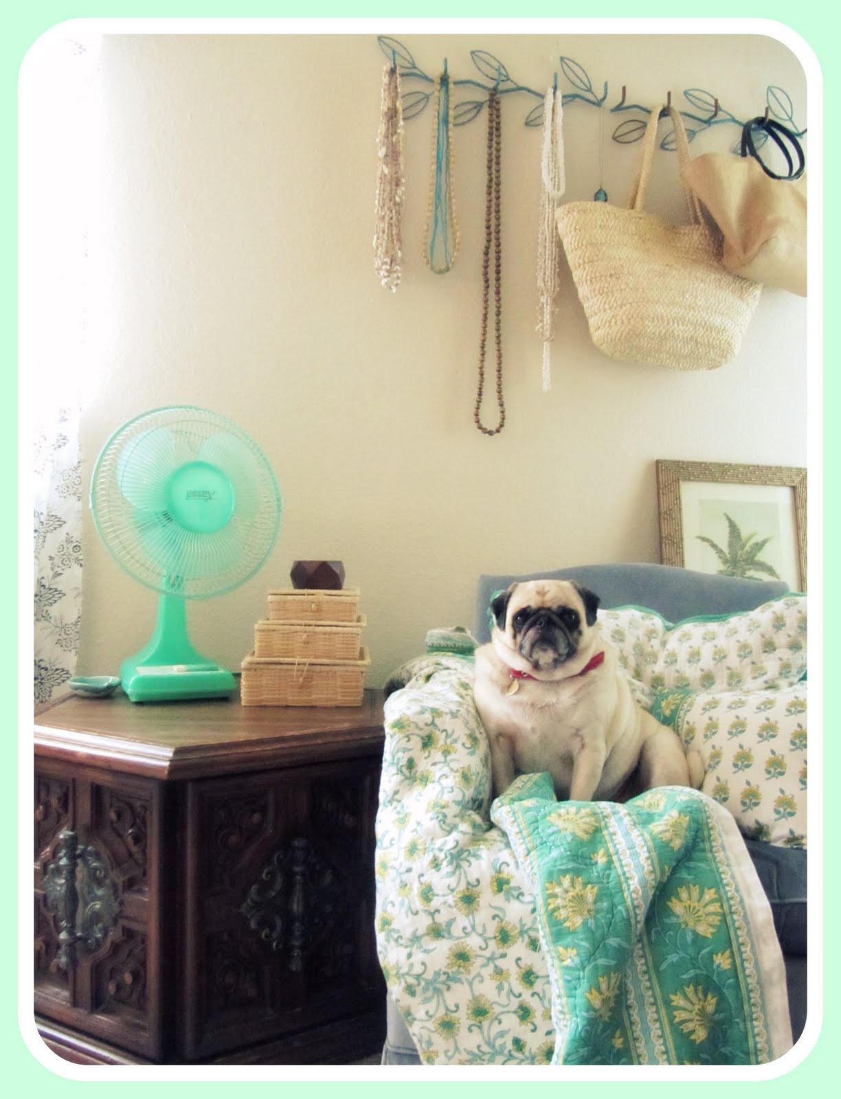 The fan is very retro looking and I love how you have the same pops of color in the room! I don't have room for much more, but I can't pass a yard sale!!